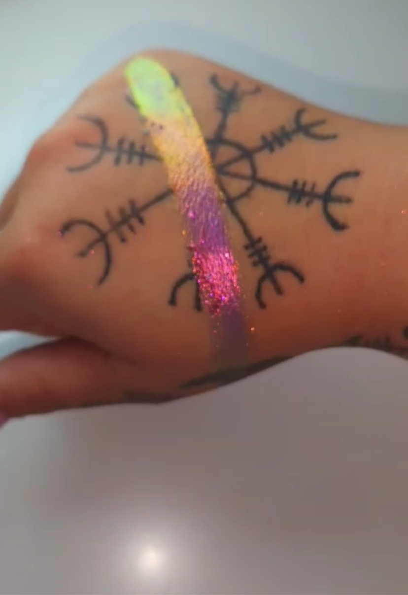 Get playful with Beneath The Blossoms - our multi chrome, handmade eyeshadow single. It's buttery, pigmented and provides colorful impact with buildable coverage. At a generous 36mm in size, it shifts orange, blue, green, yellow, and pinkish purple.